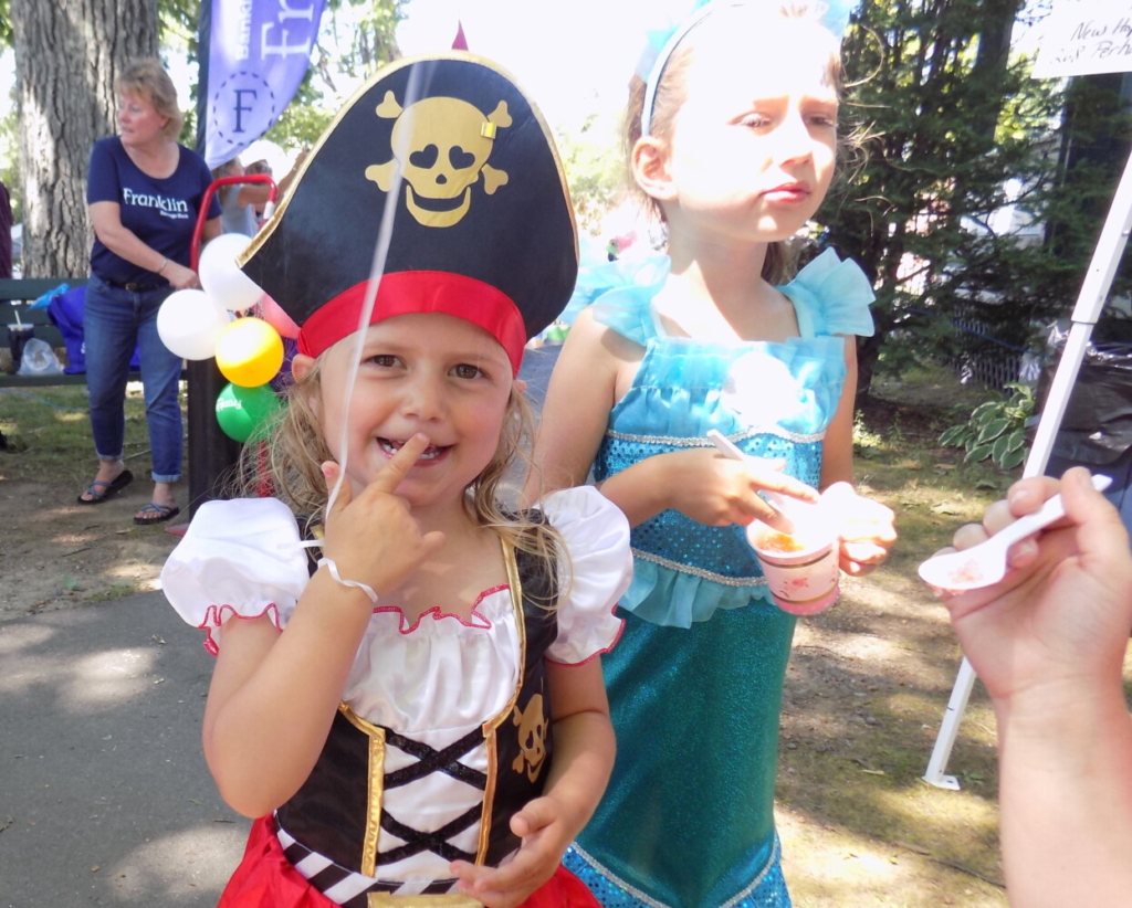Zilly Lohrey-Thompson reacts after trying a snow cone Saturday morning, July 23, in Farmington. Meetinghouse Park was filled with fun activities and free food for children as part of Summer Fest. Her sister Nola Lohrey-Thompson is behind her. Pam Harnden/Livermore Falls Advertiser