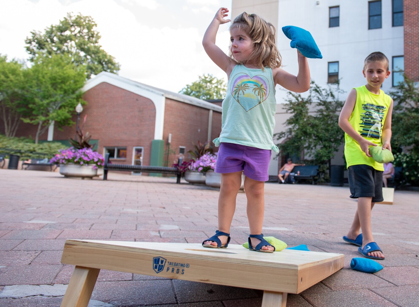 Ruby McCamish is distracted by a musician Friday night in Dufresne Plaza in Lewiston as she plays a game of cornhole, using her own set of rules, while her brother, Owen, patiently waits to toss his beanbag. They were visiting Art Walk LA with their mother. Russ Dillingham/Sun Journal