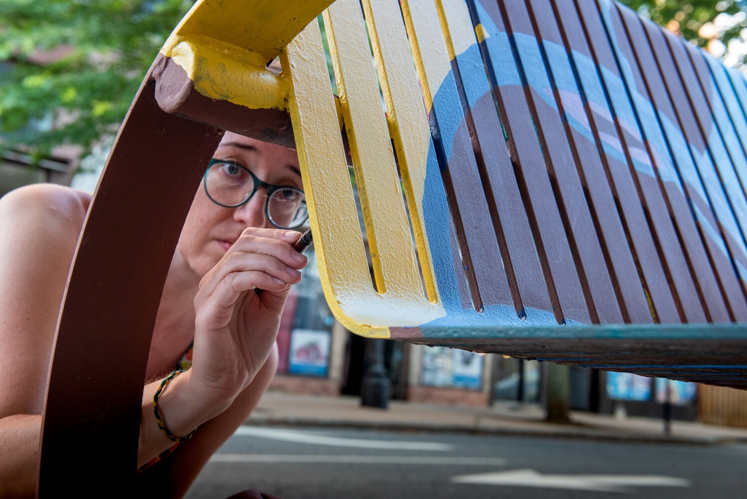 Ellen Hodgkin paints a bench Friday night on Lisbon Street in front of Munka Studio during Art Walk LA in Lewiston. She submitted her design and won the studio’s contest for a chance to paint the bench. Russ Dillingham/Sun Journal