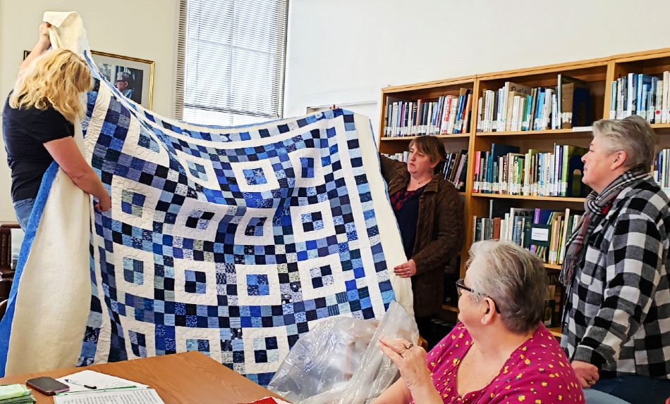 Narrow Gauge Quilters prepare the raffle quilt, Mt. Blue Memories, for display. From left to right: Sandy Wilber, Rachelle Knight, Linda Brackley (sitting) and Helen Teele . Photo by Sheila Driscoll