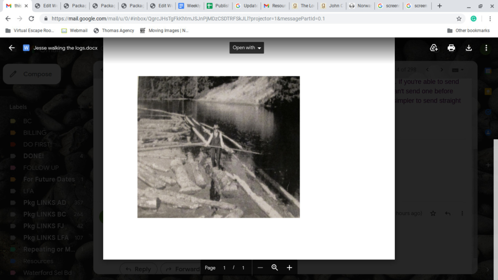 Caption: Jesse Scribner walking the logs in the mill pond with his pick pole, when he was 82.