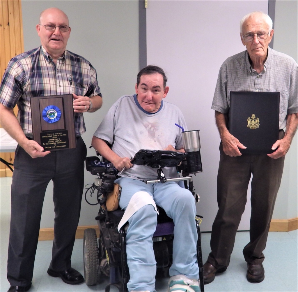 From left are Dixfield Select Board Chairman Richard Pickett, Dixfield’s Distinguished Citizen award recipient Bob McPhee, and McPhee’s friend, Ted “Bitsy” Ionta, a member of the Maine Baseball Hall of Fame. Bruce Farrin/Rumford Falls Times