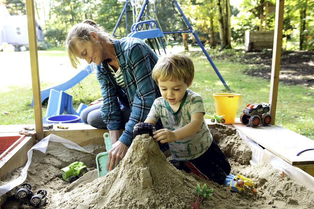 Benjamin Edwards, 2, plays in the sandbox Tuesday with his grandmother, Laura Pelletier, in Auburn. When her grandson comes over to play at her house “he calls it grammy’s playground,” Pelletier said. Daryn Slover/Sun Journal
