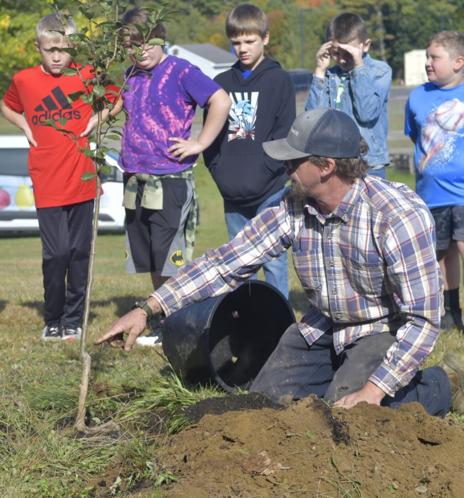 Richard Hodges, the founder and project manager of ReTreeUS, explains to students Thursday where two pear trees were grafted together while the tree is planted at Windsor Elementary School. Joe Phelan/Kennebec Journal