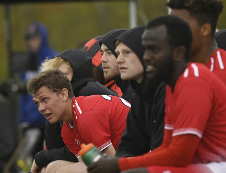 Ukrainian Sasha Bruno, left, watches the action on the field Thursday from the sidelines while playing soccer for Central Maine Community College. Bruno has become the Mustangs’ best offensive player, scoring a team-high six goals, including three game-winners, along with three assists. Shawn Patrick Ouellette/Portland Press Herald