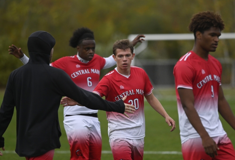 Sasha Bruno gets a handshake from a teammate after the first half of a game at Southern Maine Community College. Bruno says of the war in his native Ukraine: “It is always hard to realize when you are sitting in safety and your family is not,” said Bruno, who has an aunt and a sister living in Ukraine. Shawn Patrick Ouellette/Portland Press Herald