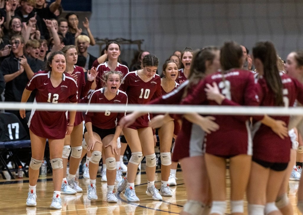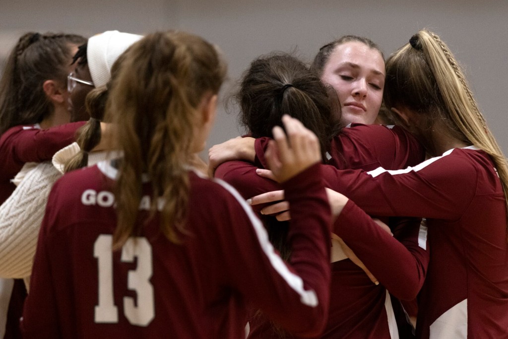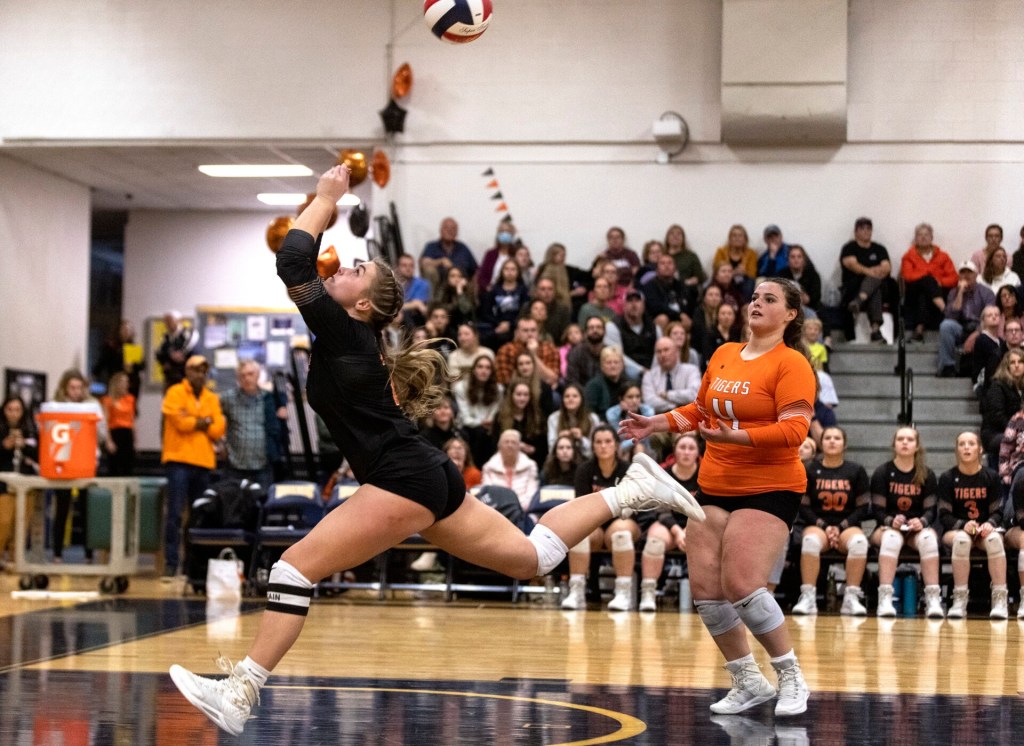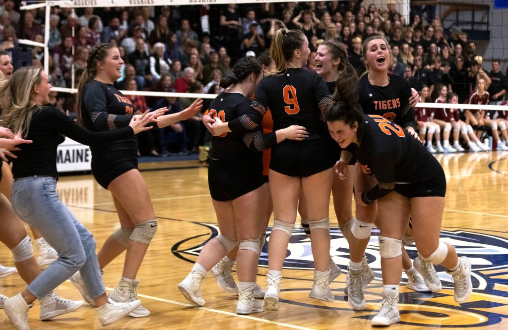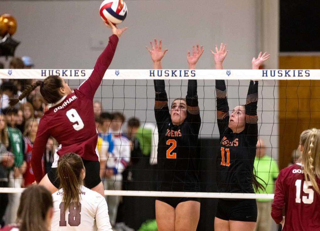 After Gorham hit the ball into the net, a Wilkinson tip-in made it 23-21. Gorham’s Lewellen answered with a kill, and when Biddeford hit it out on the next point, it was tied again. But Wilkinson again found a hole with a light touch, and two points later she stepped up again with a huge block to end the match.
