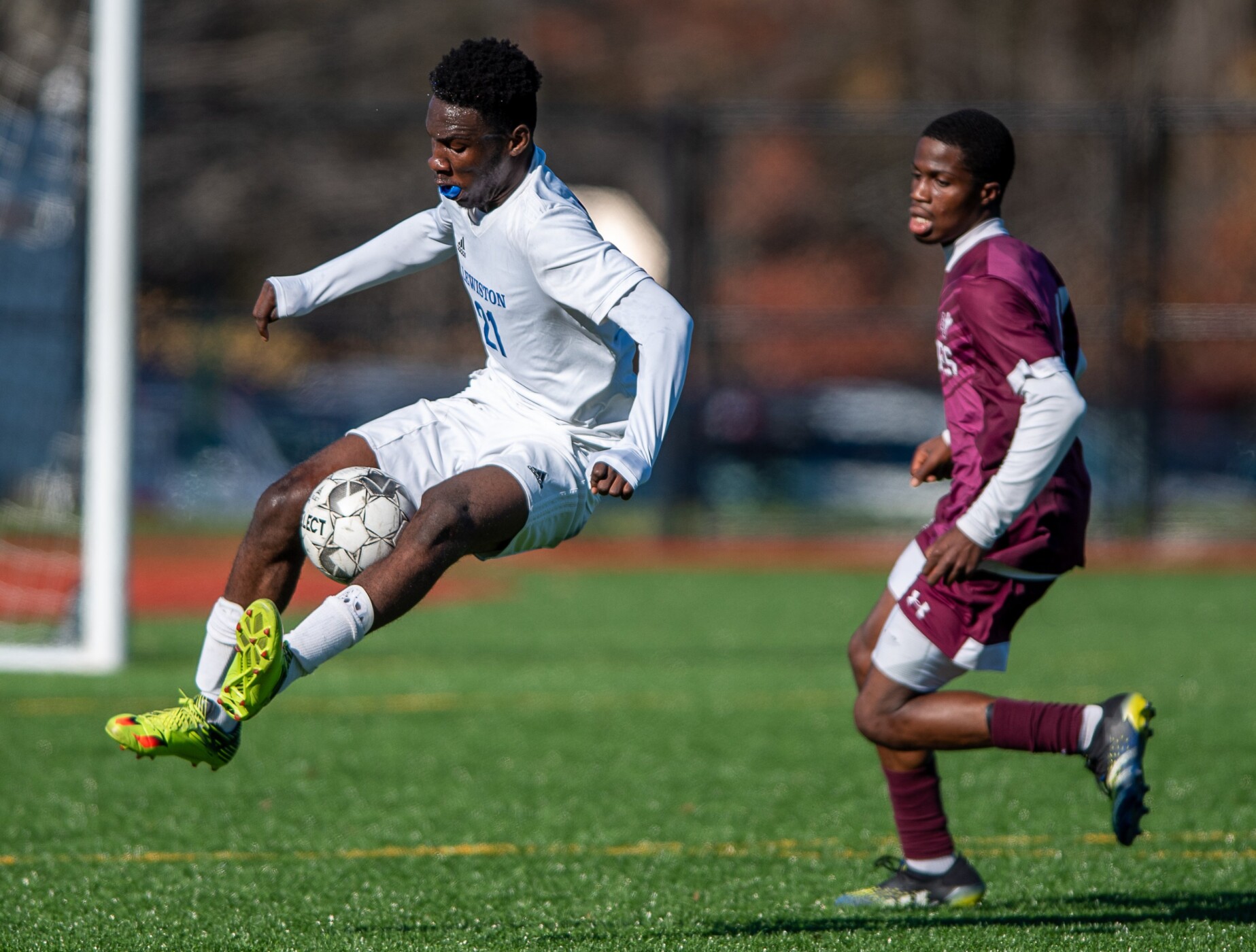 Lewiston’s Jacinto Mavinga gets control of the ball before Edward Little’s Tudum Monday can make a play on it during Saturday’s playoff game in Auburn. Russ Dillingham/Sun Journal