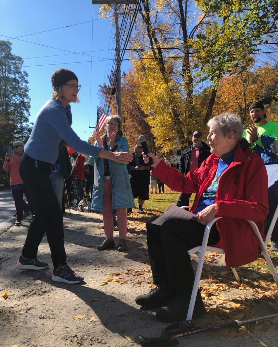 The torch for the Waterford Fall Foliage 5K Road Race and 1 Mile Fun Run for Kids was passed onto the next generation as 92-year-old founding race director Martha Eaton, right, retired after 23 years, passing her microphone over to Paula Easton, left. Submitted photo
