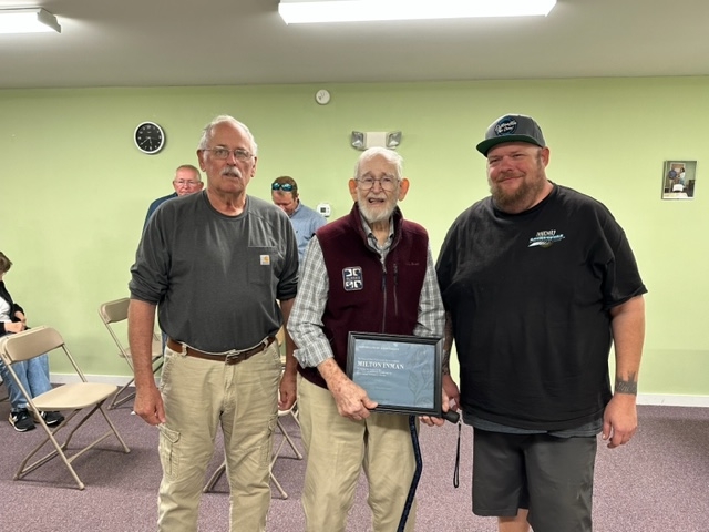 Milton Inman is presented with a Certificate of Achievement award from the West Paris Selectboard at their meeting on October 27. Mr. Inman is the winner of the 2022 Spirit of America Foundation Tribute for the Maine Chapter, for his outstanding community service in West Paris. Mr. Inman was a Scoutmaster for 8 years, a founder of the West Paris Historical Society, organized the first West Paris Soap Box Derby races, and was a member of the West Paris and Greenwood Fire Departments for over 60 years. From left, West Paris Selectboard Chair Dale Piirainen, Milton Inman, and Selectboard Member Shawn Boutilier. Submitted
