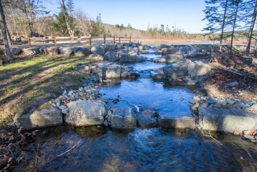 A water grade control system like this one at the outlet of Pierce and Wight Ponds at Penobscot in Hancock County will be constructed as an eventual replacement for the Little Androscoggin River dam in Oxford. Courtesy VHB, Inc.