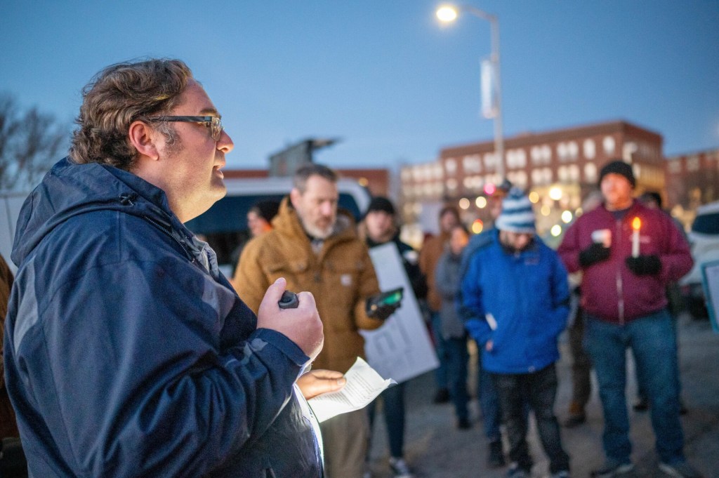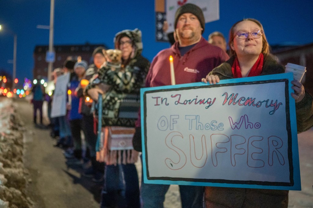 This year, instead of gathering at Trinity Church downtown, the group assembled beneath the “Hopeful” sign along Main Street, just short of the Longley Bridge. It’s a more public visible location, but for event organizers, there’s also something apropos about holding the vigil beneath a sign bearing such a message.