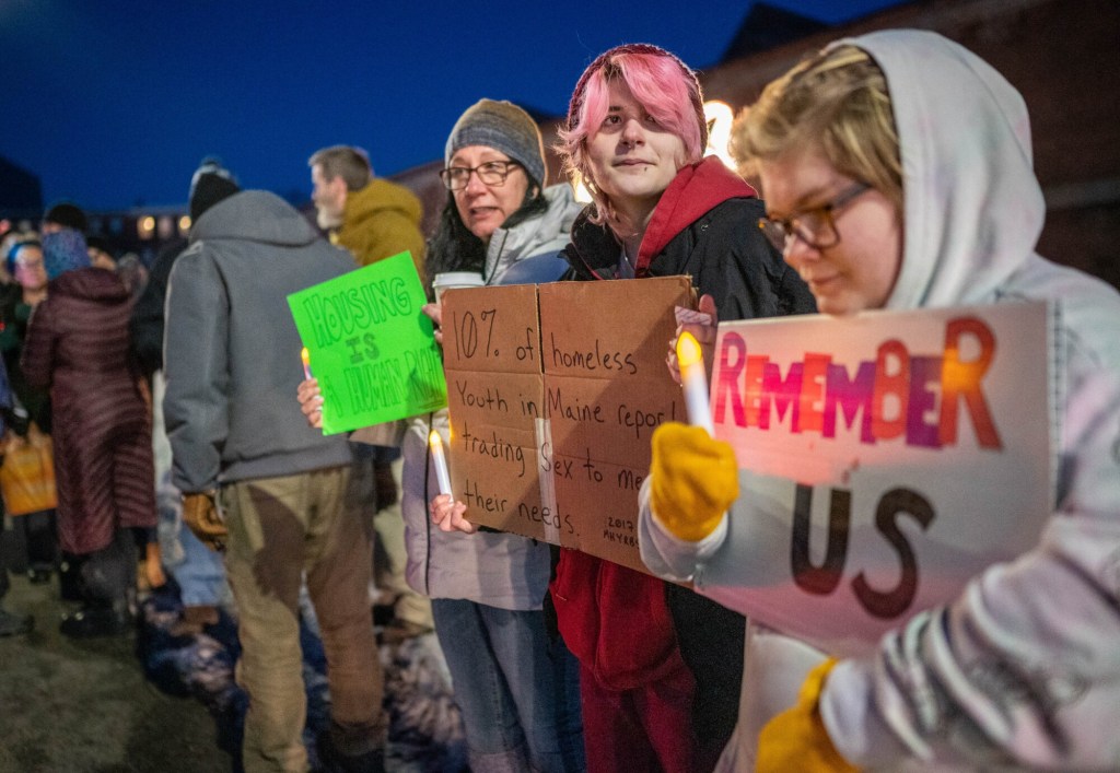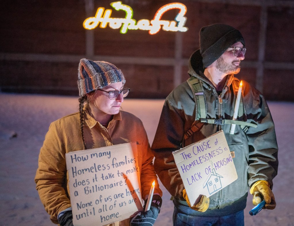 Rowan Church, 20, left, and Phoenix Bossie, 19, hold signs Wednesday in Lewiston at a vigil marking National Homeless Persons’ Memorial Day. The vigil was held on the winter solstice, the first day of winter and the longest night of the year. Andree Kehn/Sun Journal