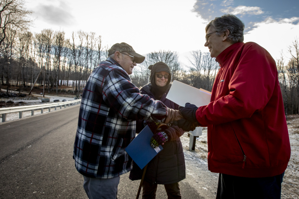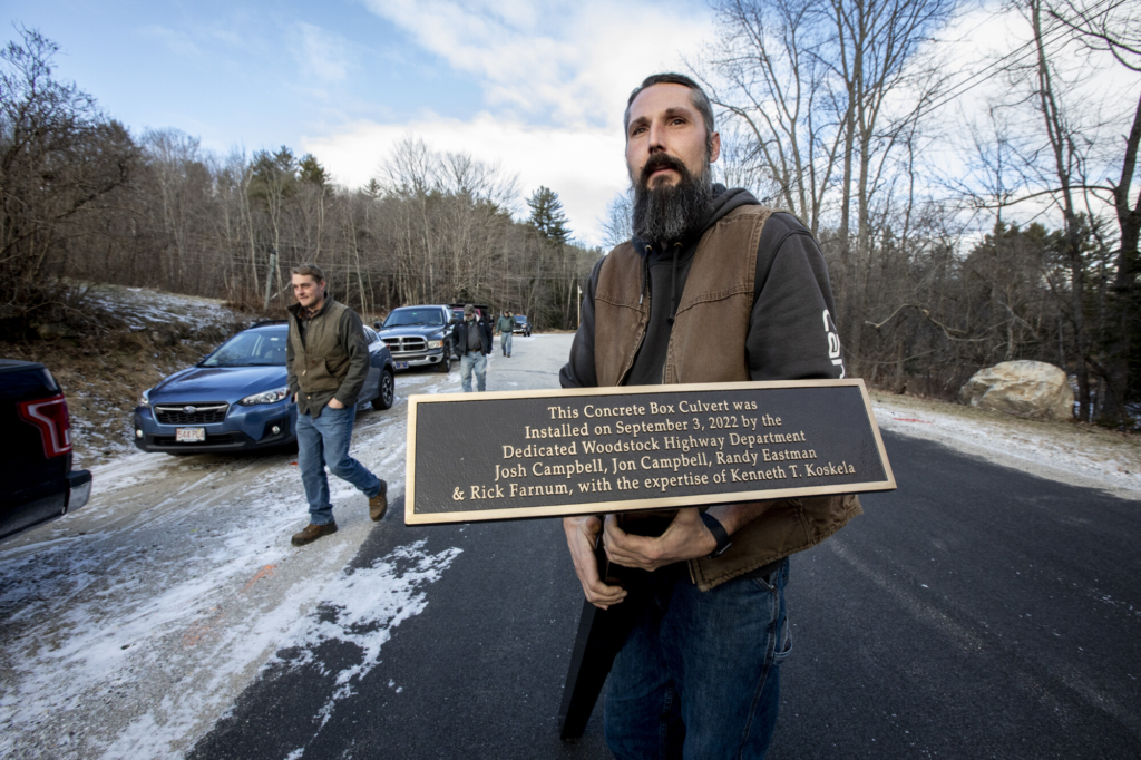Woodstock Town Manager, Vern Maxfield, right dedicated the Bacon Bridge on Old County Road to his Highway Department: Randy Eastman, from left, Rick Farnum, Jon Campbell, Josh Campbell and Ken Koskela, who acted as a general contractor, with wife Theresa Rose Lincoln/Bethel Citizen