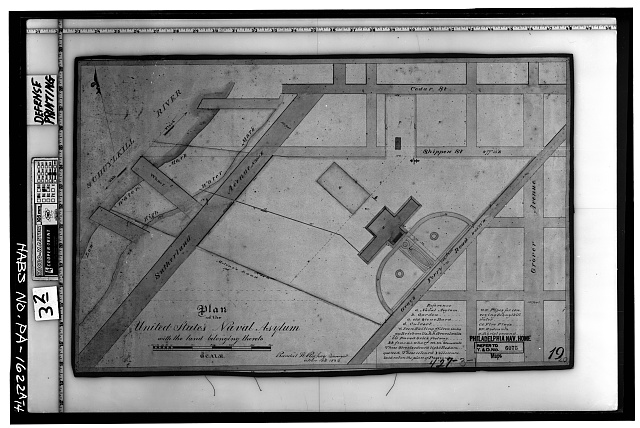 Plot map of the Naval Asylum on Gray’s Ferry Avenue in Philadelphia, Pennsylvania, surveyed in 1836 by Randal H. Rickey. Library of Congress photo