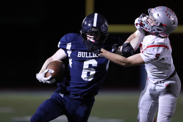 Portland’s Reegan Buck tries to fend off South Portland’s Ben Smith during the Class B South championship game at Fitzpatrick Stadium in November. A proposal by the Maine Principals’ Association would move the two rivals to Class A next fall. Ben McCanna/Staff Photographer