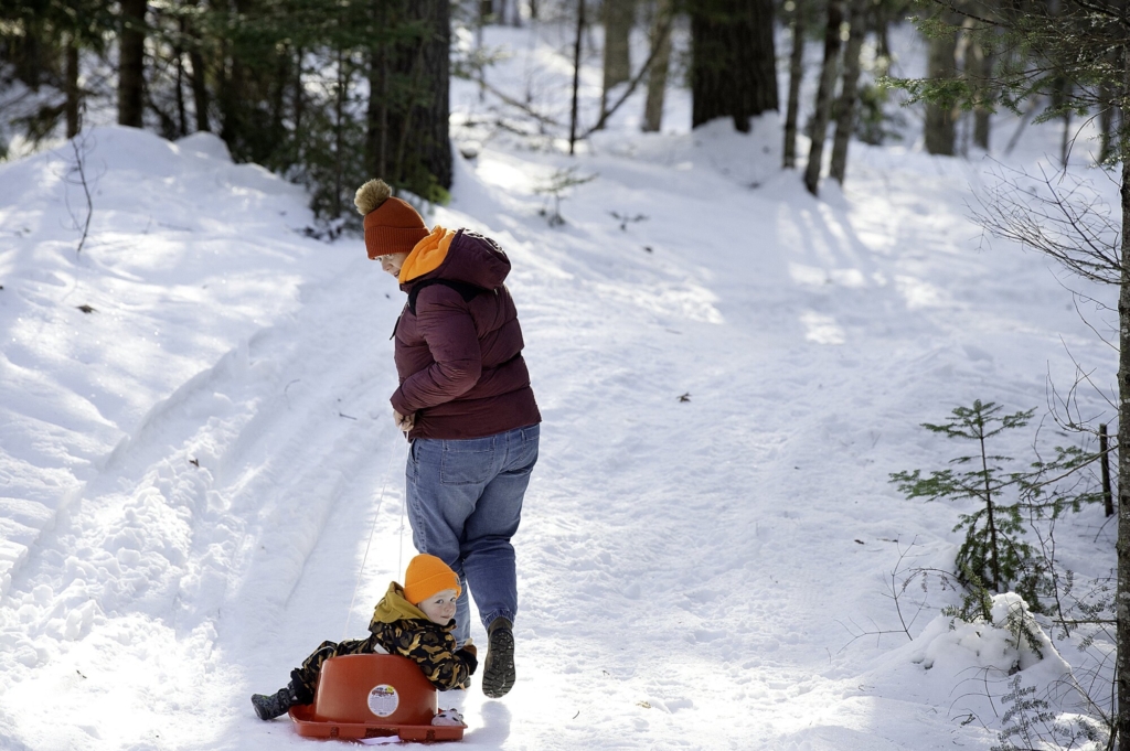 Casey Beaudoin of Winthrop pulls Sam Winter of Greene on Monday along the trail at Beaver Park in Lisbon. Beaudoin said she and the 18-month-old boy she helps care for visit the park often, but Monday was their first time this winter. Daryn Slover/Sun Journal