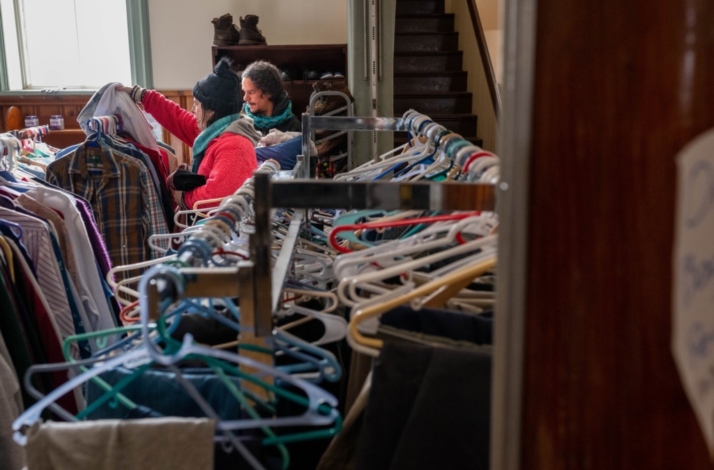 Allison Upham and her fiance, Michael Braiser, who have been living in a tent, select clothing Wednesday at the Pleasant Street Drop-in Center at the First Universalist Church, 169 Pleasant St. in Auburn. “We bury ourselves under a mountain of blankets,” Braiser said. A bus provided by the YMCA of Auburn-Lewiston will be at the center at 4 p.m. Friday and at 10 a.m. and 3 p.m. Saturday to bring people to the Auburn Housing Authority’s warming shelter at its Family Development Center on Valerie Circle. The center will open at noon Friday and remain open — including overnights — until noon Sunday. The buses will drop everyone off at the Pleasant Street Drop-in Center at noon Sunday. Andree Kehn/Sun Journal