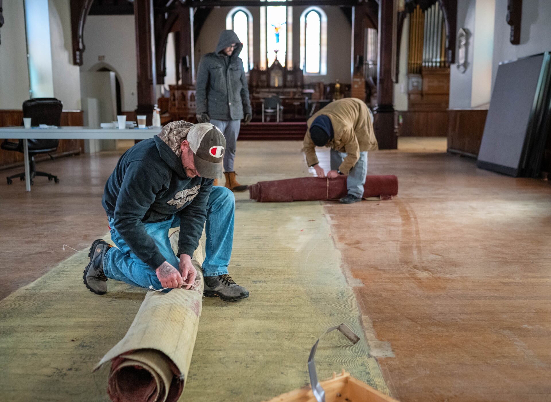 Amos Robbins secures a piece of carpet Feb. 5 at Trinity Church in Lewiston, as Donald Townsend and Joseph Carter work behind him. Volunteers from A Hand Up, a sober living house, and The Maine Prisoner Re-Entry Network are working over the weekend to remove the pews and tear up the carpeting. The church is being “reinvented” as Trinity Commons, a multipurpose community center. “Church will continue, but it won’t be the only thing. We are in the neighborhood and for the neighborhood,” says Klara Tammany, the senior warden of Trinity Church. The floor is scheduled to be refinished, and a labyrinth inspired by Chartres Cathedral in France is to be painted on the floor. The church is raising money for sustainably designed chairs that use seat belt webbing to replace the pews. Andree Kehn/Sun Journal