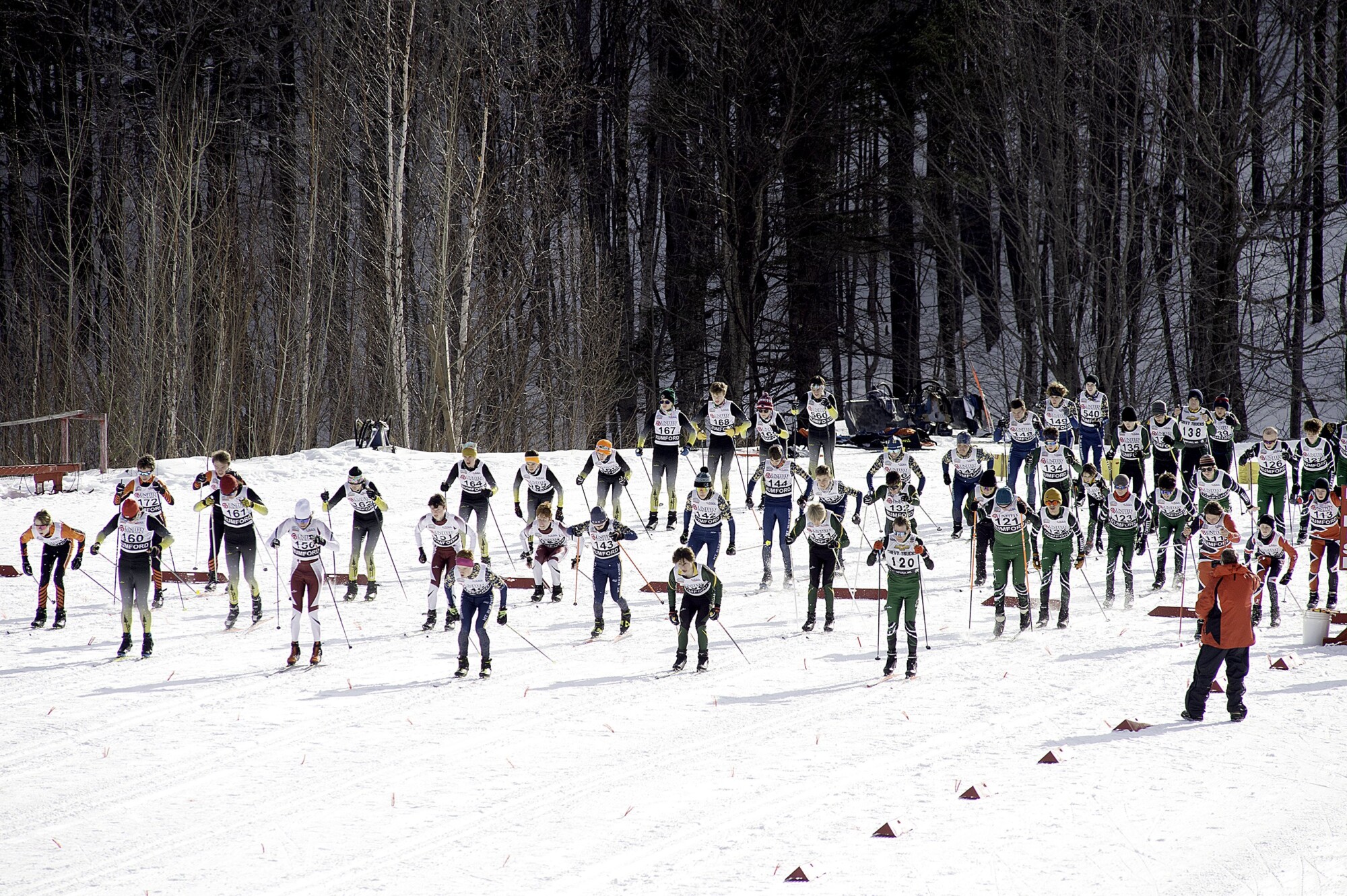 The high school boys’ race begins Feb. 7, the first day of the KVAC Nordic Championships at Black Mountain in Rumford. Logan Ouellette of Leavitt Area High School in Turner crossed the finish line four seconds ahead of Henri McCourt of Mt. Blue High School in Farmington to win the freestyle mass start race. Day two was at Titcomb Mountain in Farmington. Daryn Slover/Sun Journal