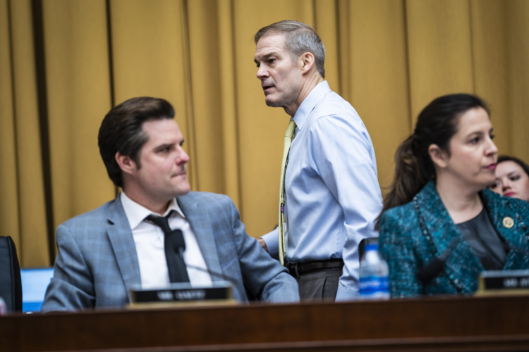 Rep. Matt Gaetz, R-Fla., Chairman Jim Jordan, R-Ohio, and Rep. Elise Stefanik, R-N.Y., at a meeting of the House Select Subcommittee on the Weaponization of the Federal Government on Feb. 9. Washington Post photo by Jabin Botsford