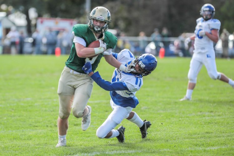 Oxford Hills’ Tanner Bickford works for extra yardage against Lewiston’s Jibril Holloman during an October game in Paris. Bickford is one of four Vikings chosen to play in the Lobster Bowl in July. Brewster Burns photo