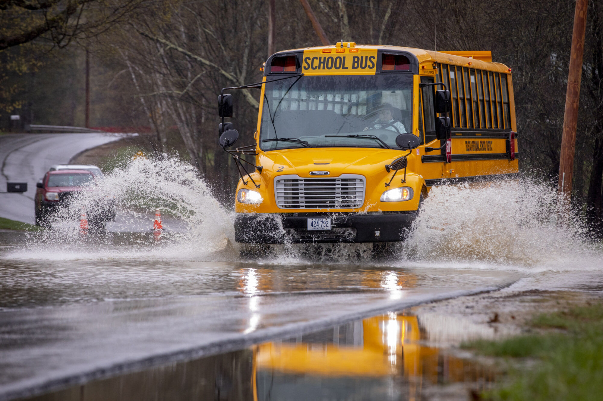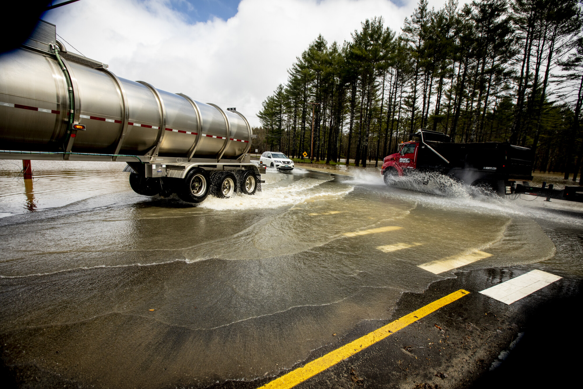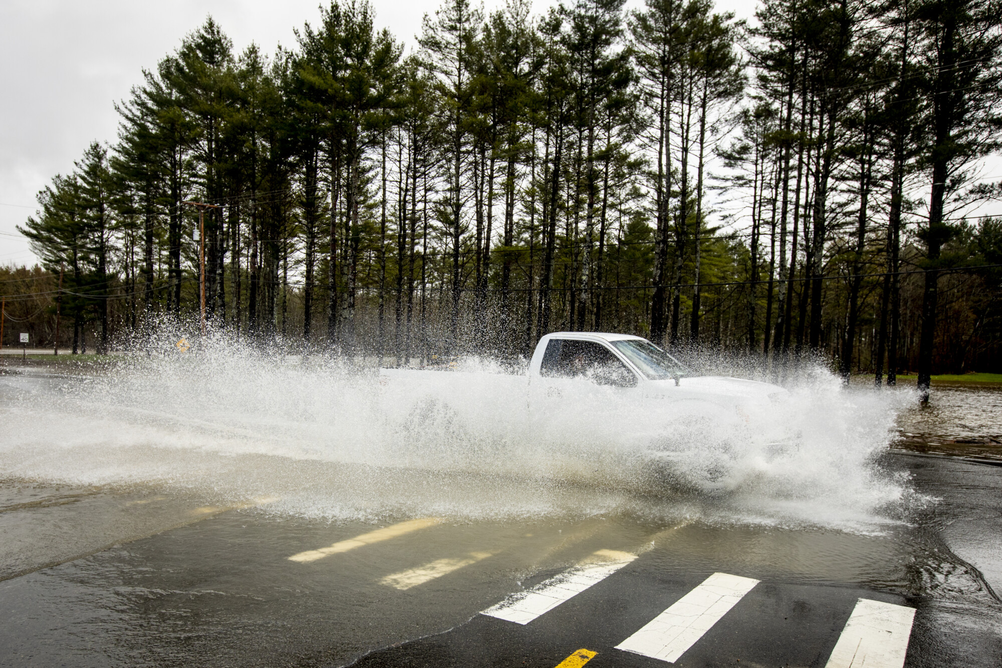 Water sprays off a truck travelling through flooded route 26, where it intersects Parkway Road. in Bethel. Rose Lincoln