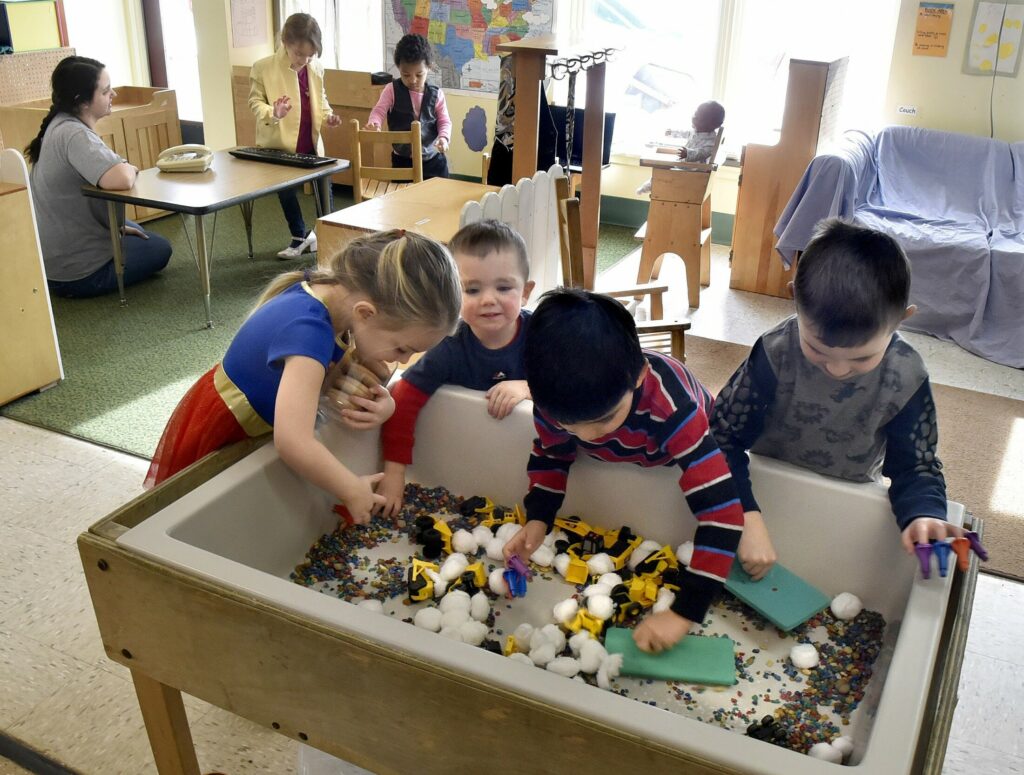 As University of Maine at Farmington student Jocelyn Rocray works with children in the background, others play at the Sweatt-Winter Child Care and Early Education Center in February 2019. David Leaming/Morning Sentinel file