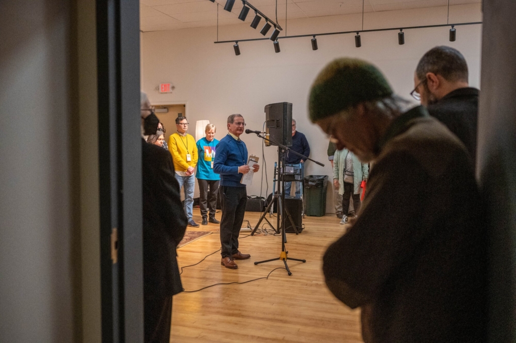 LA Arts board Chairman James Parakilas addresses a crowd in February during the organization’s grand opening celebration for its new location at 168 Lisbon St. in Lewiston. Andree Kehn/Sun Journal