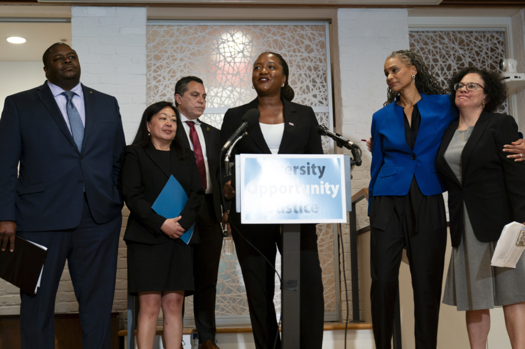 Janai Nelson, president and director-council of the Legal Defense Fund, along with other civil rights leaders, speak to media after the U.S. Supreme Court ruling on affirmative action in college admissions on Thursday, June 29, in Washington. AP Photo/Stephanie Scarbrough