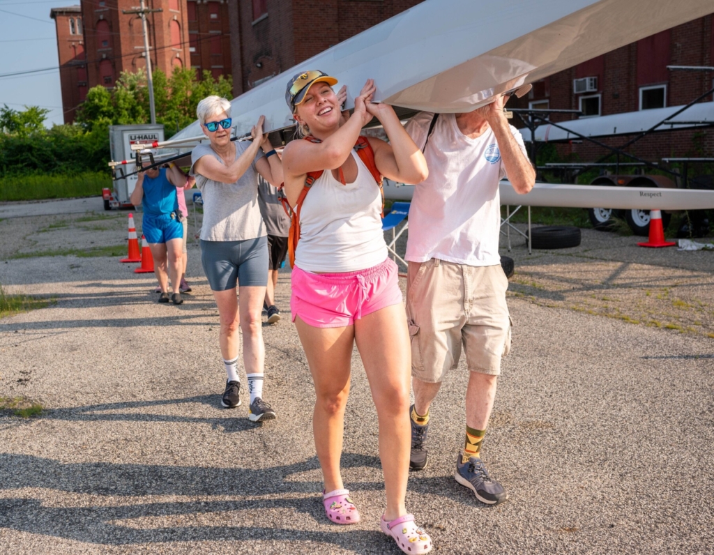 Maisy St. Cyr, front left, leads a crew of volunteers Tuesday carrying a rowing scull to the docks at Simard-Payne Memorial Park in Lewiston for a shakeout before this weekend’s Riverfest Regatta. The races start at 8 a.m. Saturday and the best viewing is from the pedestrian Jenkins Memorial Bridge in the park. Helping carry the scull are Vernon Cox, right, and Cynthia De Soi, behind Cyr. Not shown are Chris Coughlan, Amy Smith, Amy Sanchez, Dave Barnard and Betsy Shew. Andree Kehn/Sun Journal
