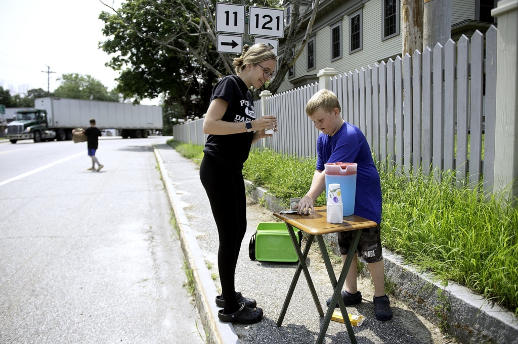 Greyson Yates, 9, sells a cup of lemonade Monday to Cassandra Roy while Lucas Lee, 10, lets motorists know about their business venture in downtown Mechanic Falls. “I’m trying to grow up and pay for my own things,” Lee said. “Someone told me that it feels good if you pay for your own things.” Daryn Slover/Sun Journal