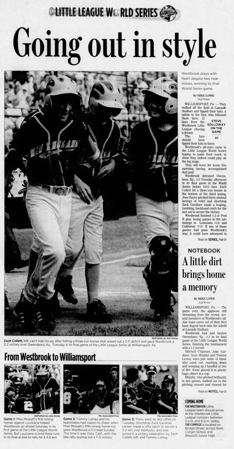 Westbrook acquitted itself well in Williamsport. The Maine representative went 1-2, losing to Louisiana (3-2) and California (7-3) before finishing by beating Kentucky, 3-2. Even the losses didn’t ruin the majesty of the moment; Royer gave up a grand slam in the California loss that went 260 feet, landing 50 feet past the fence.
