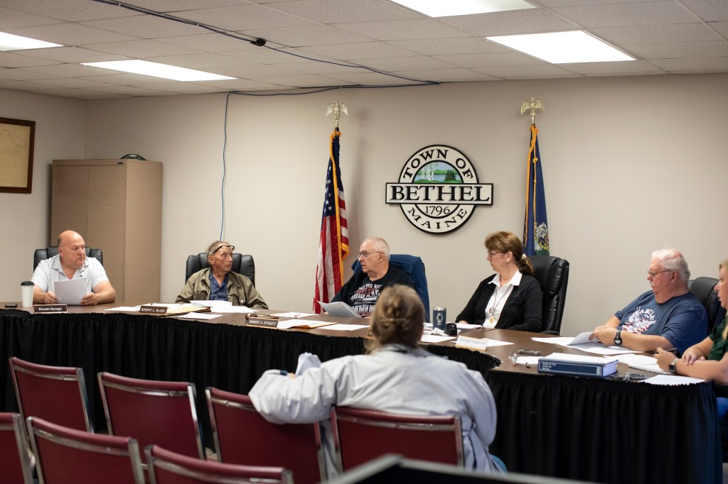 Ron Savage, from left, Robert Blake, Robert Everett, Michele Cole and George Angevine are Bethel’s Board of Assessors. They met on Aug. 31 at town office. Rose Lincoln/Bethel Citizen