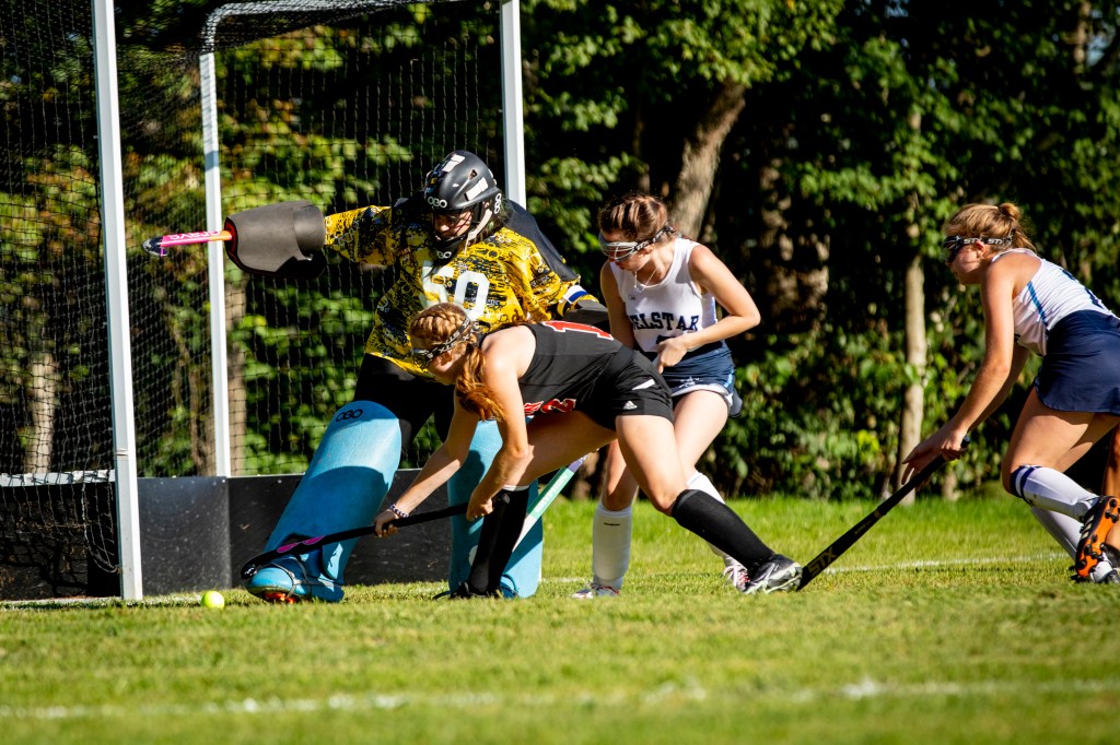 Telstar High School field hockey goalie, Cadie Campbell, fights to keep Lisbon from scoring during this Aug. 31 match-up. Lisbon did not score here but went on to defeat Telstar, 2-0 in a hard fought match-up. Rose Lincoln