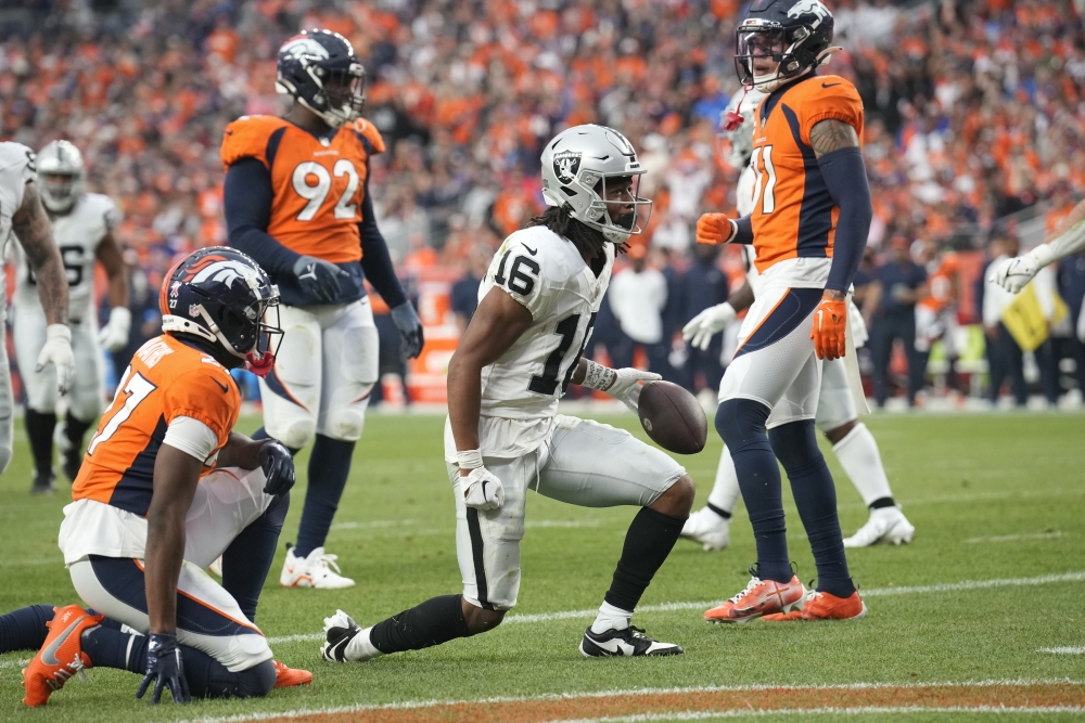 Raiders wide receiver Jakobi Meyers makes one of his two touchdown catches last weekend in a season-0pening victory over the Denver Broncos. Meyers has been ruled out of Sunday’s game against the Bills because of a concussion. David Zalubowski/Associated Press