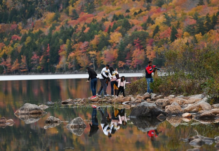 A family walks and hops along the shore of Jordan Pond in Acadia National Park. Local businesses are worried that a looming federal shutdown will close the park as it did during peak foliage season in 2013. Shawn Patrick Ouellette/Staff Photographer