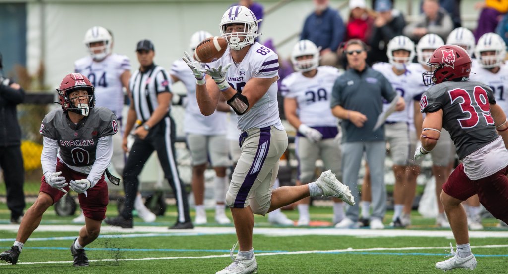 On third-and-goal, Bosselait looked to Guerrette, who has 16 receptions the past two weeks, but his throw to the end zone deflected off the tight end. But running back Ryan Lynskey was nearby, and he hauled in the loose ball for an 8-yard touchdown catch. Marcos Ruiz’s extra point cut Amherst’s advantage to 17-7 with 8:06 remaining in the game.