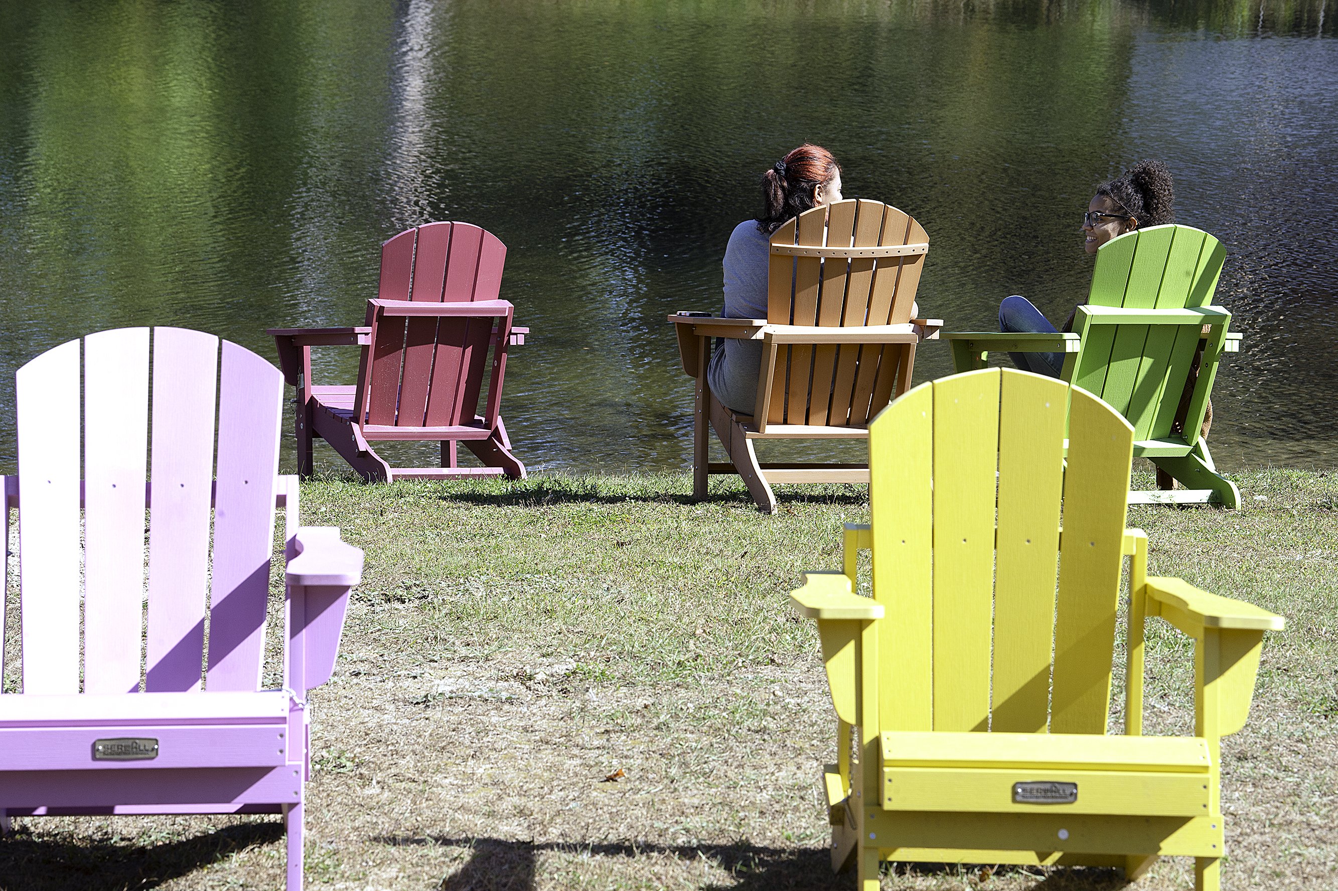 Amya Dudevoir, left, of Auburn and Jazmin Willette of Turner chat Oct. 2 at Lake Grove Park in Auburn. Park rangers from the Auburn Public Works Department assembled the colorful Adirondack chairs in July. The park at 2 Fair St., off Route 4, is also referred to as Municipal Outlet Beach or the Outlet. Daryn Slover/Sun Journal