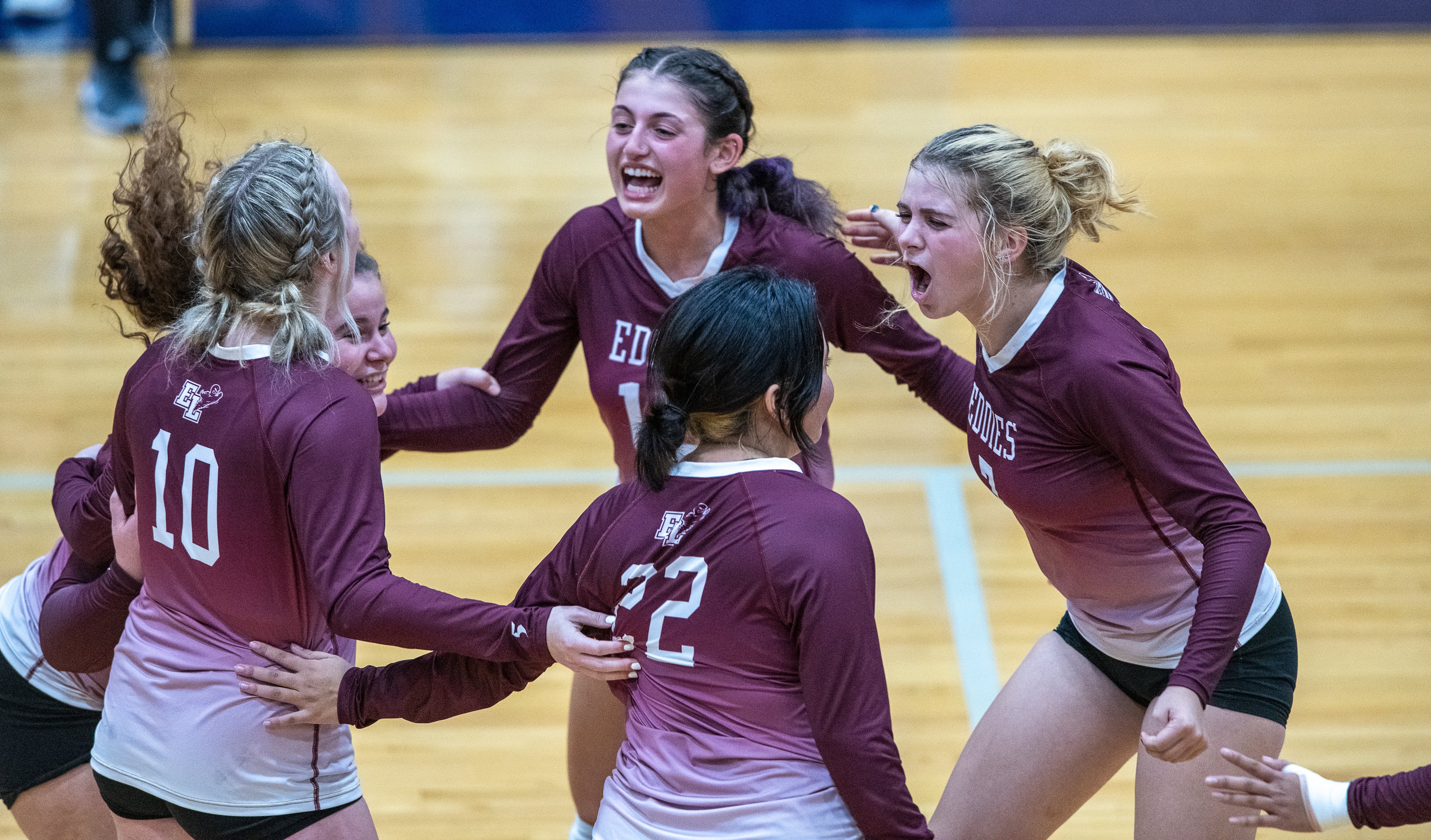 Volleyball players from Edward Little High School in Auburn react Oct. 5 after winning a game against Lewiston High School during a match in Lewiston. Russ Dillingham/Sun Journal