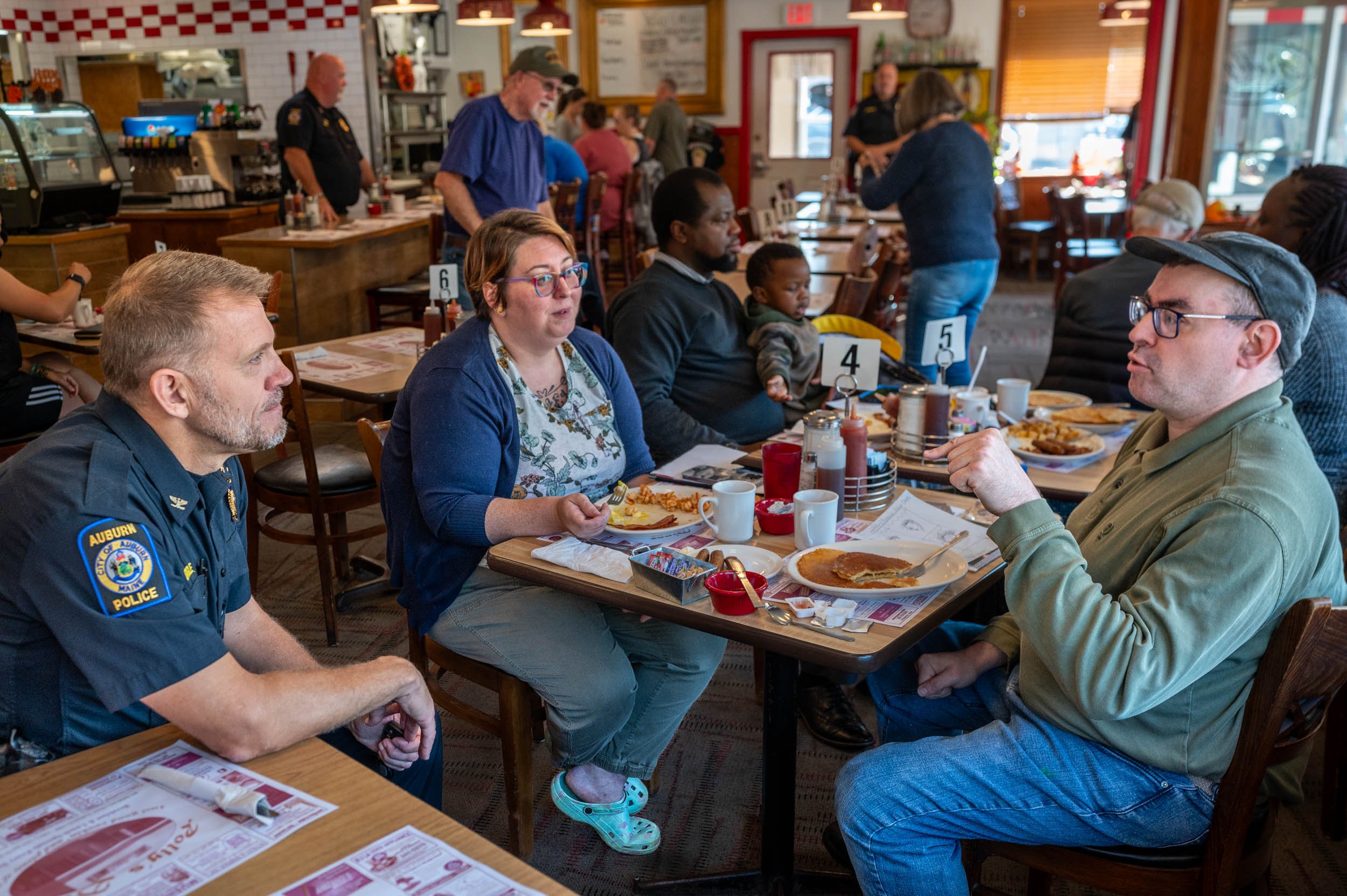 Deputy Chief Timothy Cougle of the Auburn Police Department speaks Oct. 4 with Steve Covacs, who says he read about National Coffee with a Cop Day and came down with Mel Pitcher, center, to take advantage of the opportunity. “I’m a hobnobber,” Covacs says, adding he plans to dress as a police officer this year for Halloween. The event’s goal is to break down barriers between police officers and other members of the community and to build trust. Andree Kehn/Sun Journal