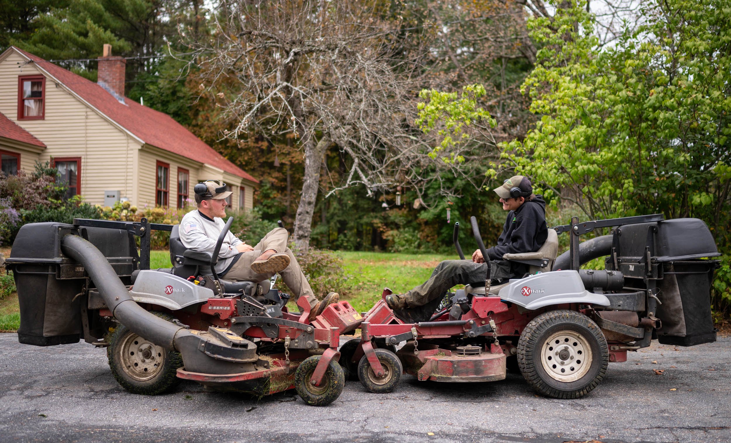 Jacob Wilcox, left, and Dominic Bourgoin of Goodscapes Lawn Care & Landscaping of Lewiston decide Oct. 6 how they will handle a lawn in Auburn. The men say they are ready for the changing seasons and the jobs that come with them. “I do like seeing the finished product,” Wilcox says. Bourgoin says he looks forward to finishing the fall cleanups and then beginning snowplowing. Andree Kehn/Sun Journal