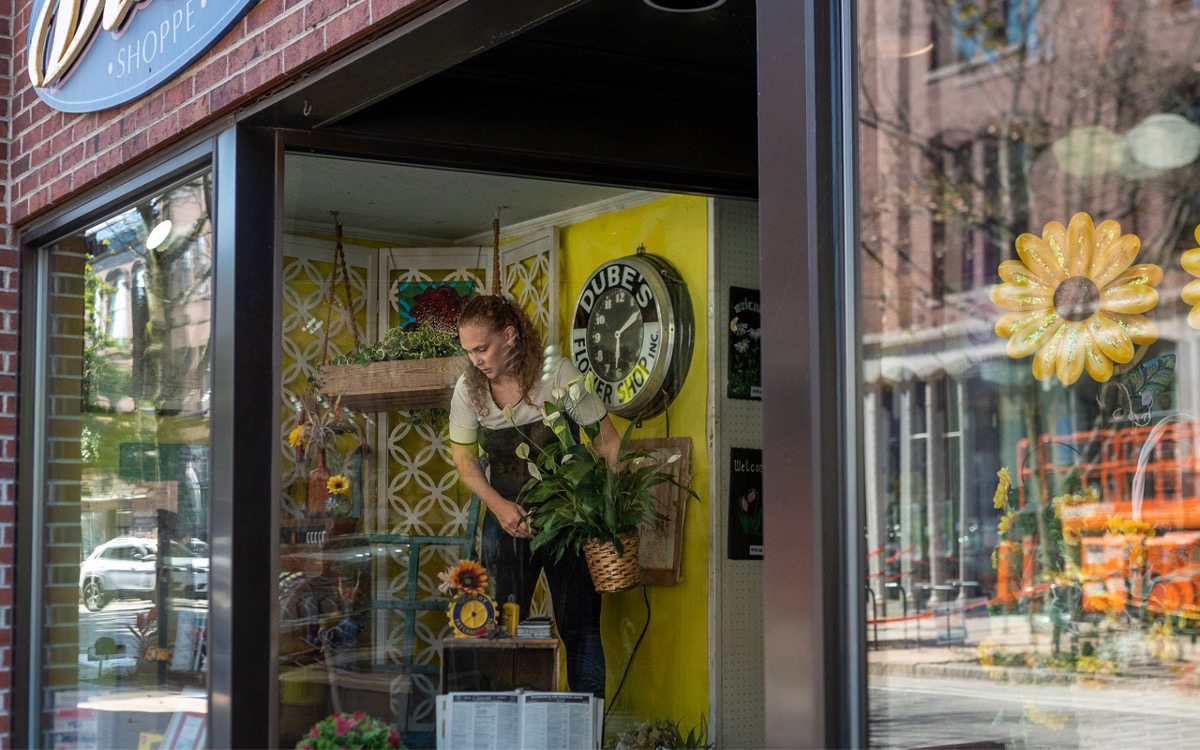 Amy Griswold arranges the front window Oct. 4 at Dube’s Flower Shop at 195 Lisbon St. in Lewiston. Griswold says she recently bought the longtime business with Abigail Jones-Skrabak. Andree Kehn/Sun Journal