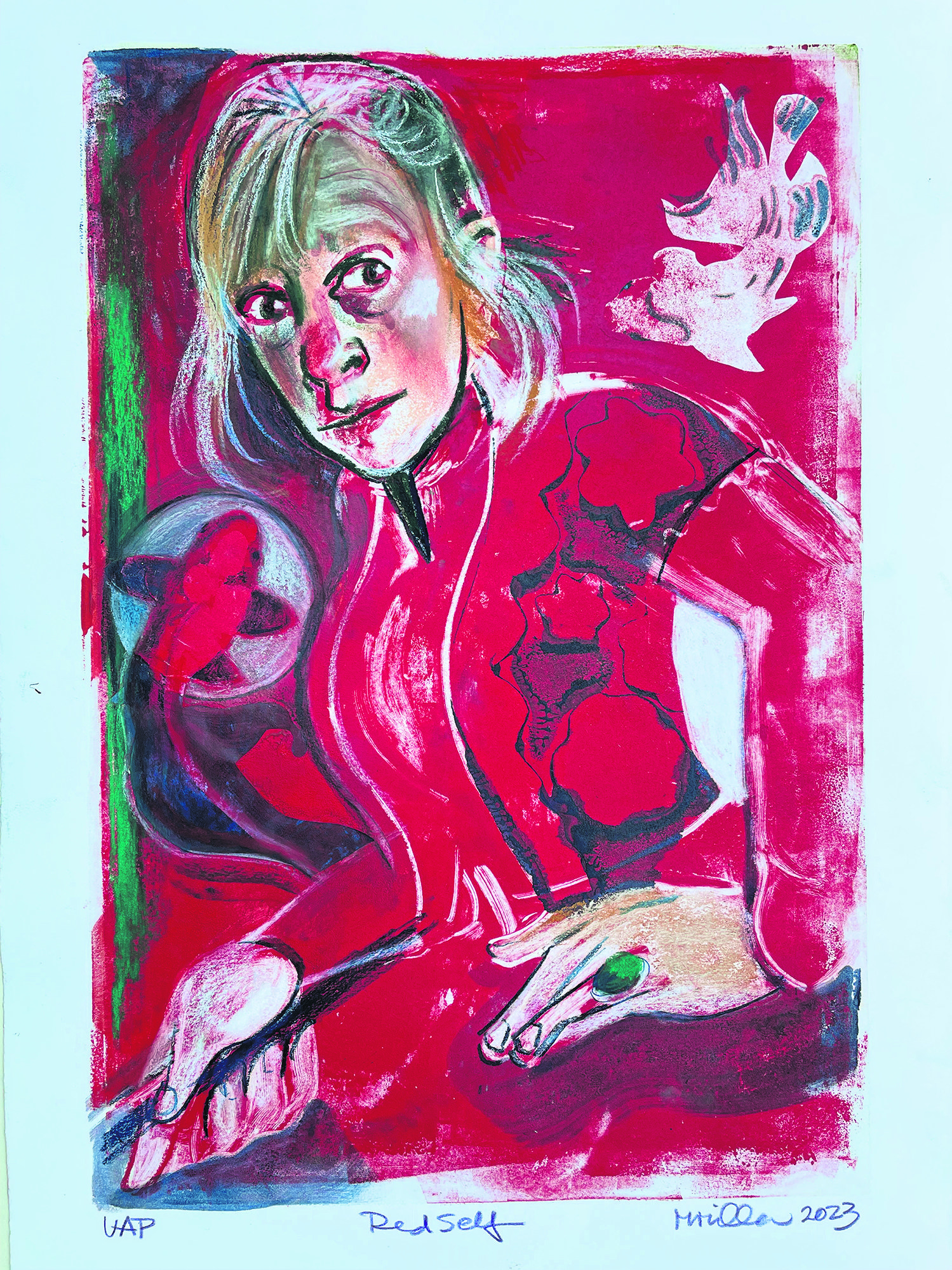 Miller describes her self-portraits as “pictures from the pages of my life; the life of a woman, an artist, a wife, a mother, a grandmother. They tell stories of joy and struggle, and of the different roles a woman plays in living this life. In my drawings I strive to illuminate my spiritual connection to the outer natural world as well as to the dark inner realm of dream and symbol, making manifest images of a personal mythology.”