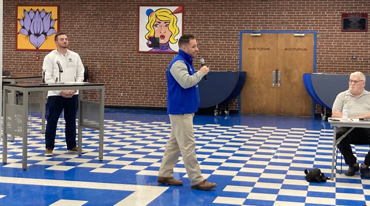 Mountain Valley High School Assistant Principal Craig Milledge speaks Tuesday night to Regional School Unit 10 directors at the school in Rumford. He said the school will host a presentation and workshops in November facilitated by the nonprofit organization Students Empowered to End Dependency, or SEED. At left is high school Principal Tom Danylik and at right is Director Dan Hodge of Rumford. Marianne Hutchinson/Rumford Falls Times