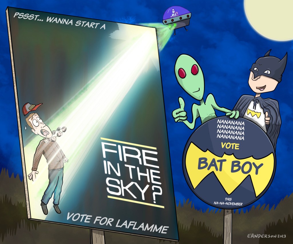 Was riding downtown the other day, through a field of campaign signs, when I spotted one such sign that was round instead of the uniform rectangular. How refreshing! Why, it looked like a lollipop sticking up from the ground, ready for licking. Tell me, why DO campaign signs have to be rectangle? It’s boring. For this reason, I’ve decided to throw my full support behind the candidate innovative enough to step outside the box and go with a different shape. Good luck, Eryn LeClair! We’re pulling for you.