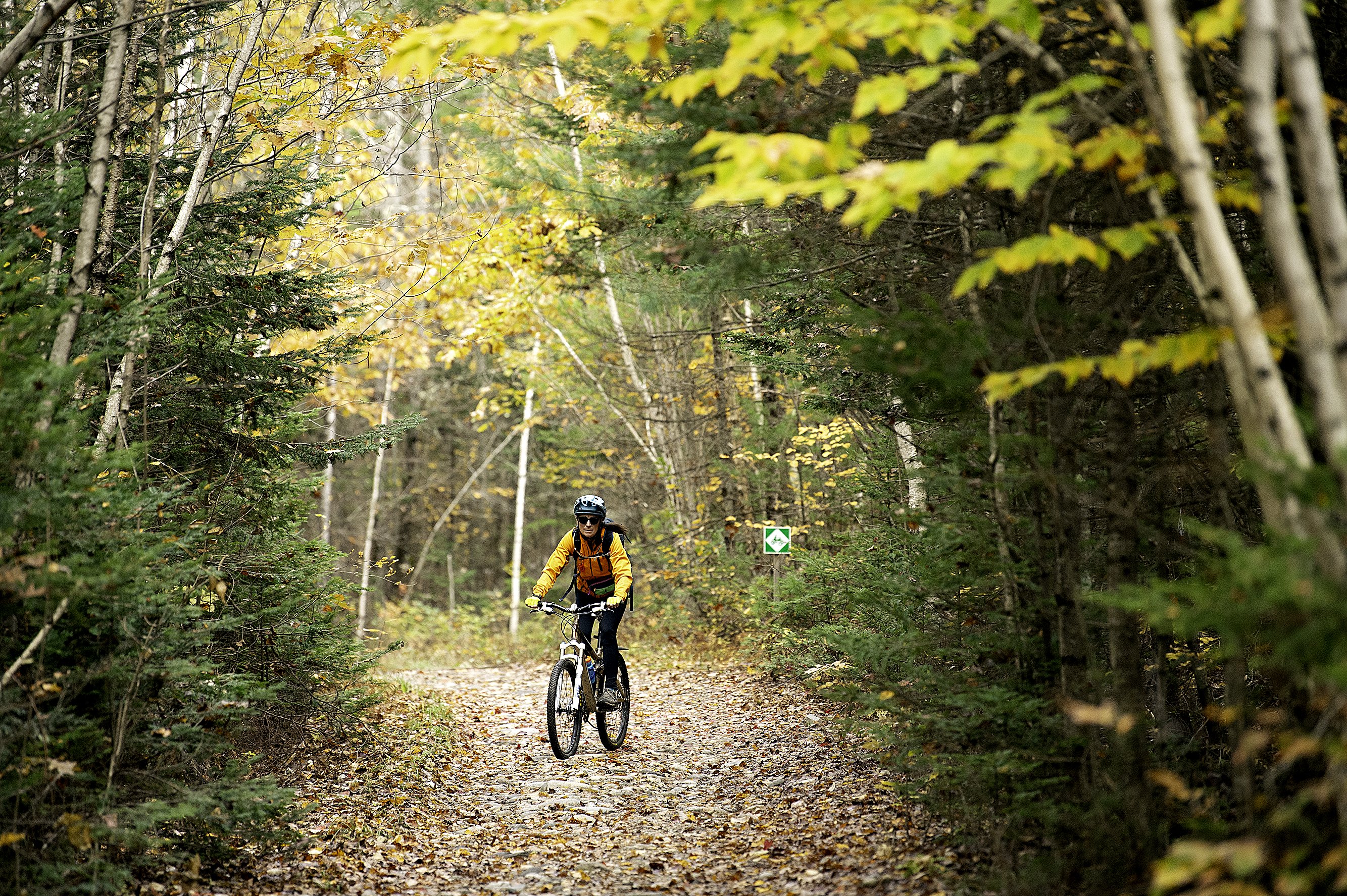 Karen Francoeur of Castine rides her mountain bike Tuesday through the Androscoggin Riverlands State Park in Turner. Francoeur said she ended up in the park after an odd chain of events. In return for Francoeur making a donation to Maine Public Radio, Lee Auto Malls conditioned her car for free. While waiting for her car to be detailed at Lee, Francoeur found the Riverlands’ trails on a map. So, she rode her bike up Route 4 to the south entrance of the park by the former Twitchell Airport. “That’s why I’m here and that’s why I’m on my bike,” she said. Daryn Slover/Sun Journal