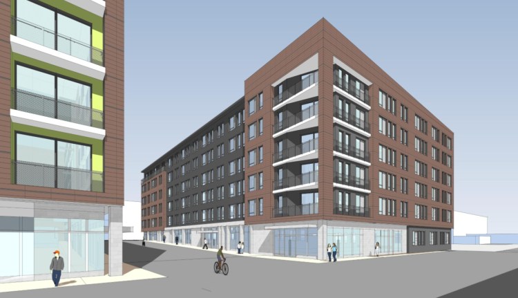 An architect’s rendering shows the approved 172-unit building at 3 Lowell St., which will be constructed just across the street from Auburn Mayor Jason Levesque’s recently approved 150-unit building. City of Lewiston