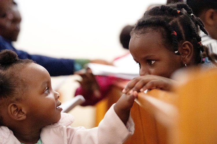 Children glance over the pew during African Mass Oct. 15 at the Basilica of Saints Peter and Paul in Lewiston. Daryn Slover/Sun Journal
