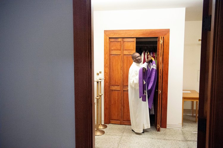 Father Felix Barutwanayo prepares to conduct Mass Oct. 15 at the Basilica of Saints Peter and Paul in Lewiston. Daryn Slover/Sun Journal